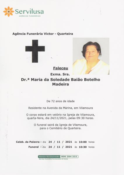 O Lions Clube de Vilamoura cumpre “o muito doloroso dever de comunicar o súbito falecimento da Vice-Presidente do Lions Clube de Vilamoura, a nossa CL Soledade Madeira, esta madrugada.
