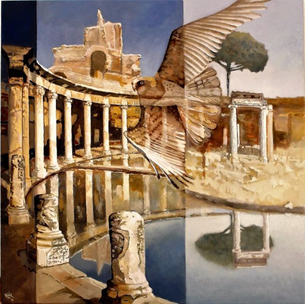 Pinta especialmente o período do Renascimento italiano e a arquitetura antiga da Grécia, numa série de pinturas expostas com o título “MUNDOS ANTIGOS“.