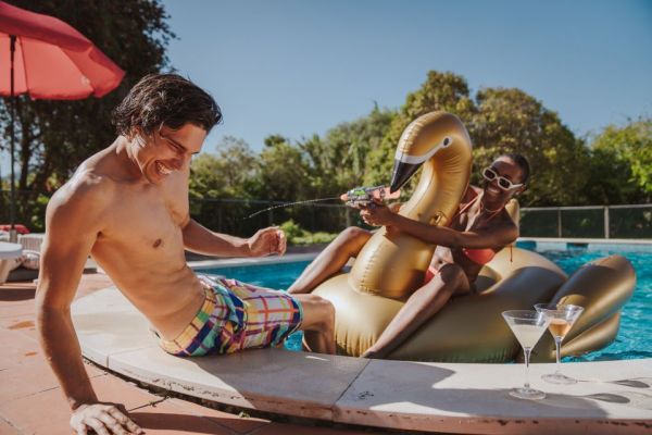 A Coleção Floats of Fun SS22 apresenta insufláveis extra large em forma de cisne, asas de borboleta, concha, arco iris e unicórnio, sempre em tons suaves e metálicos, como o bronze. Da coleção fazem ainda parte os famosos tube floats e um chaise longue, tudo em dimensões macro, porque a diversão é para ser vivida ao máximo.