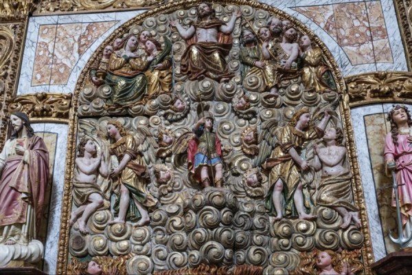 A lista de trabalhos não é das mais extensas mas cada tarefa é um desafio e pode, por isso, demorar. Angela Zenato é uma espécie de maestro, que coordena os trabalhos técnicos. Italiana, como o arquiteto chamado pelo então bispo do Algarve para reconstruir o monumento após o terramoto de 1755, a perita em restauro admite que é preciso paciência para este trabalho “levamos uma semana a dez dias só para perceber qual a melhor metodologia a usar num grande painel que removemos para averiguar a estabilidade da estrutura e de todo o retábulo”. Camadas de sujidade, algumas causadas pelo fumo das velas, tornavam impossível identificar de imediato certas cores da pintura. “Havia figuras que aparentavam ter vestimentas vermelhas e douradas, mas também poderiam ser verdes e douradas. Não se percebia bem os tons”, acrescenta. Com calma e cuidado, com a ajuda de alguns solventes menos agressivos, aos poucos tem sido possível devolver a leitura do painel que representa as almas e o juízo final. Entre as imagens percebem-se figuras santas, como a Virgem Maria, São João, São Miguel e Jesus Cristo ao meio, além de personagens como anjos.