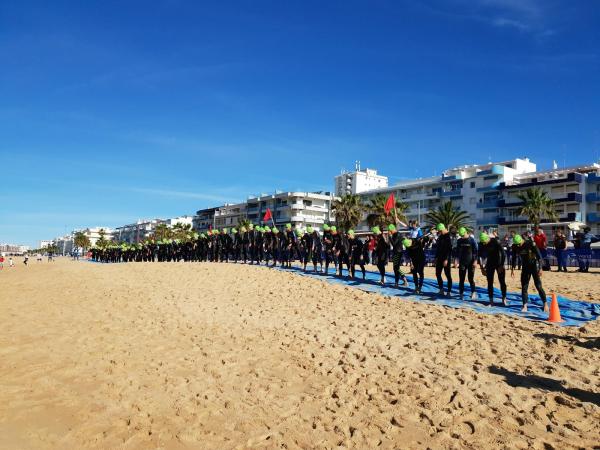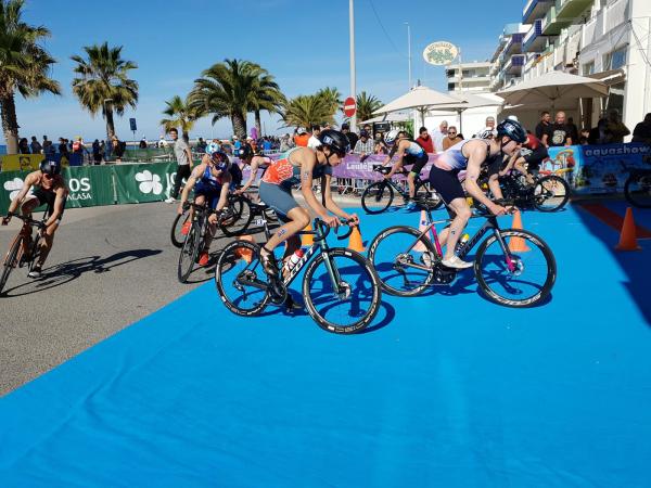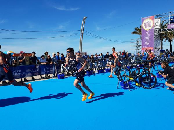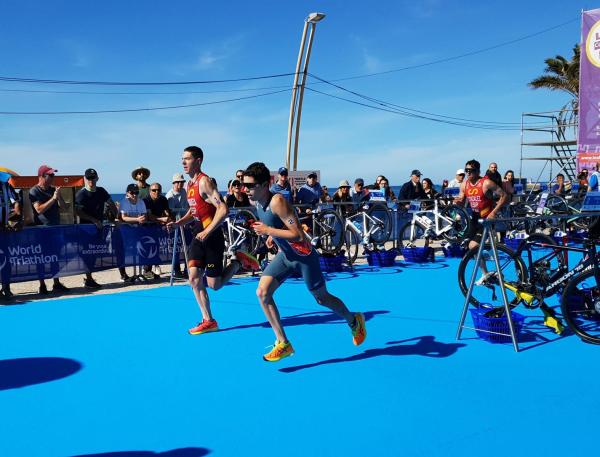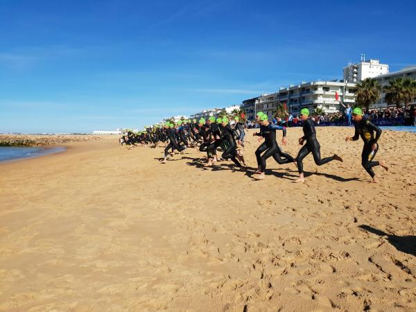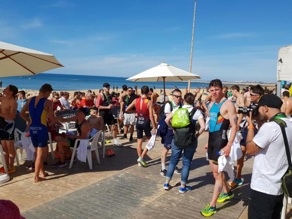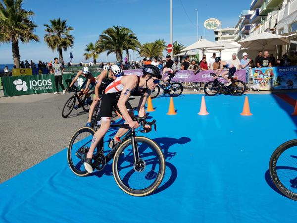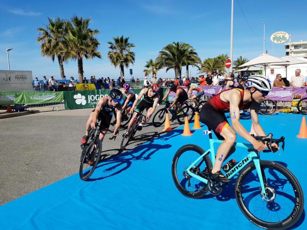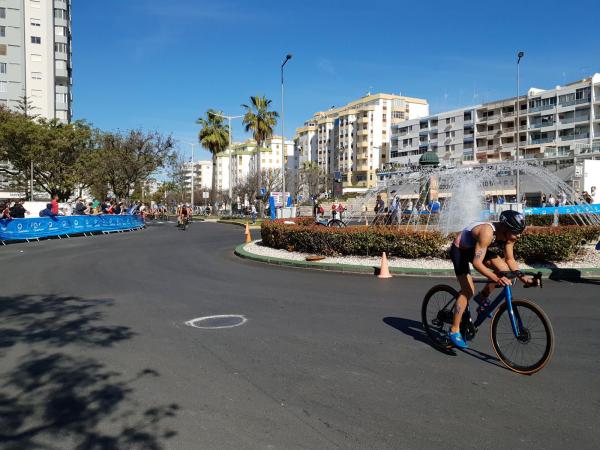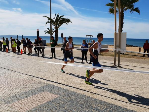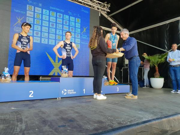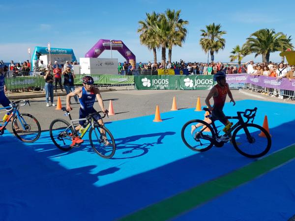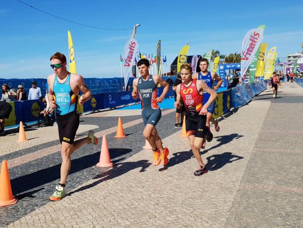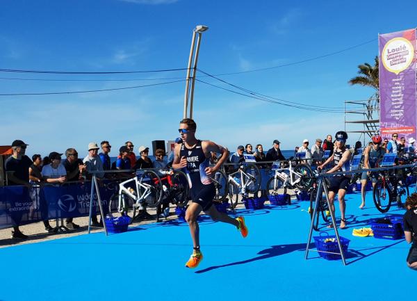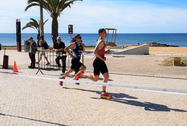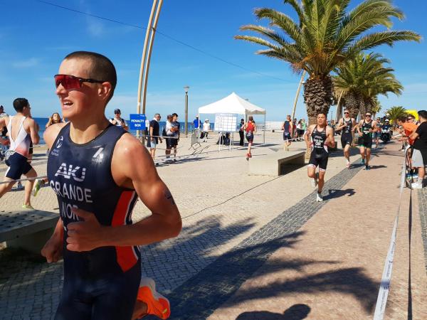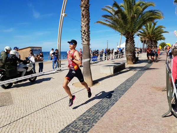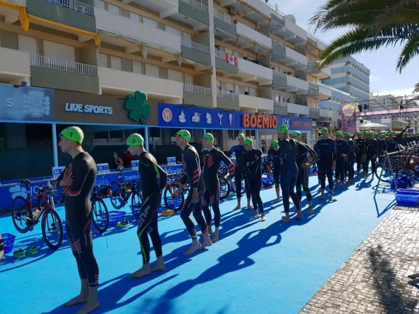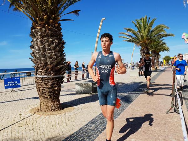João Nuno Batista, o triatleta nacional júnior que se sagrou vice-campeão mundial em Quarteira em 2021, fez uma natação muitíssimo competente, saindo da água na primeira posição muito destacado.