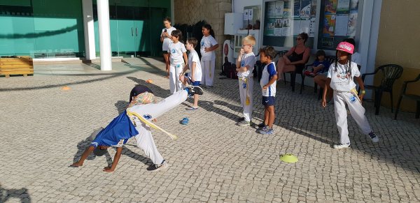 Uma aula muito animada com os petizes a aprenderem os primeiros movimentos da filosofia Capoeira, ministrada pela Associação Alegria e Bem-Estar, em Quarteira.