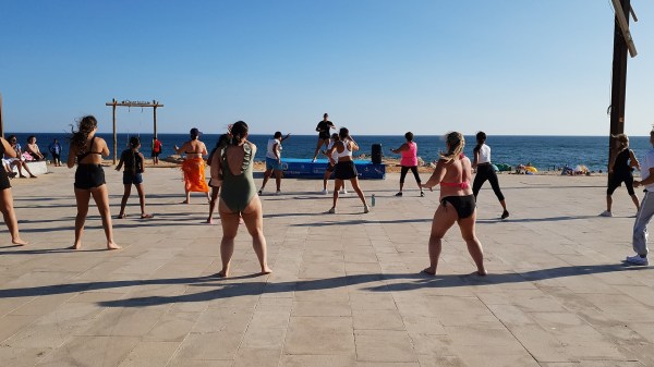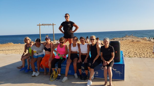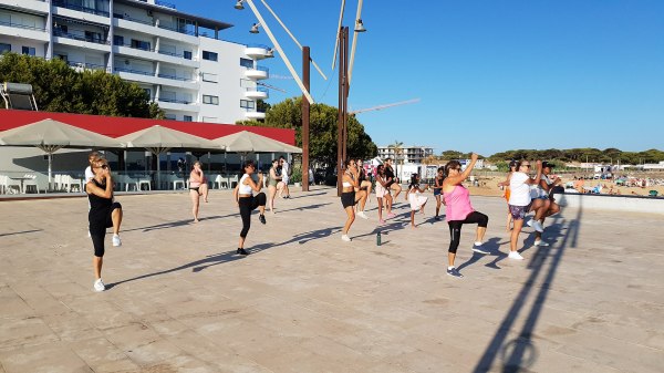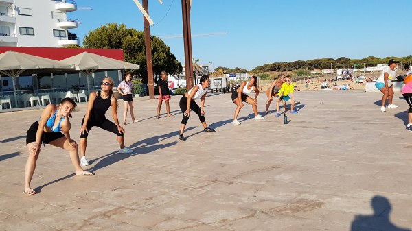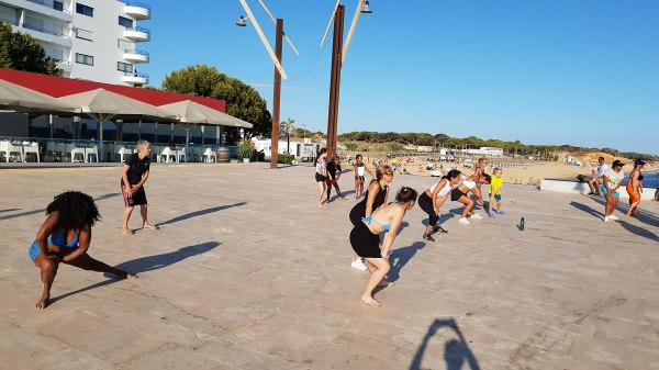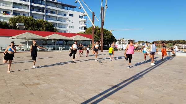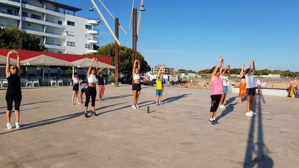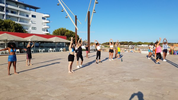 Residentes e veraneantes participaram nesta aula aberta no palco da Gaivota para tornar um fim de tarde mais ativo, inclusive um grupo de crianças indianas a fazer as coreografias na praia.