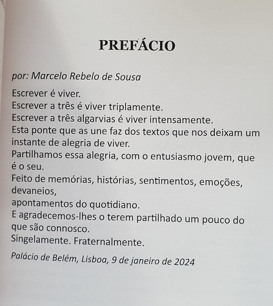 Vanda de La Salete acrescentou ainda que “o prefácio é da autoria do nosso Presidente da República, o qual, tal como nós, também é uma pessoa fora da caixa, com umas ideias extraordinárias. A ele, fazia-lhe muita confusão porque é que eu escrevia tanto e nunca publicava nada. Se calhar, nem dormia por causa disso. Entretanto, aceitei o desafio dele e comecei a publicar algumas coisas. No caso deste livro, falámos com ele e perguntámos se estaria disponível para fazer o prefácio e assim foi, resultando num prefácio muito bonito, muito leve. No livro, podem constatar que todas nós tivemos origens diferentes, com culturas diferentes”.