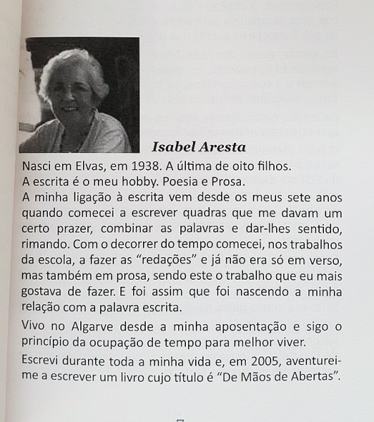 Isabel Aresta sublinhou que “desde sempre gostei de escrever. Para mim, escrever e colocar no papel aquilo que me vem à mente é uma espécie de libertação. Ao mesmo tempo, escrever também me serve de companhia e ocupação do tempo. Afinal, ler e escrever são terapias. As ideias surgem quando de manhã acordo. Prefiro escrever no papel em vez de no teclado do computador. Pegar na caneta e sentir o papel tem outro encanto. As letras do alfabeto são como bailarinas que dançam em pontas dos pés, guiadas pela ponta da esferográfica que orienta a melodia. Escrever é um verbo com muita imaginação. Gostar de escrever é um dom que Deus me ofereceu e a quem agradeço todos os dias”.