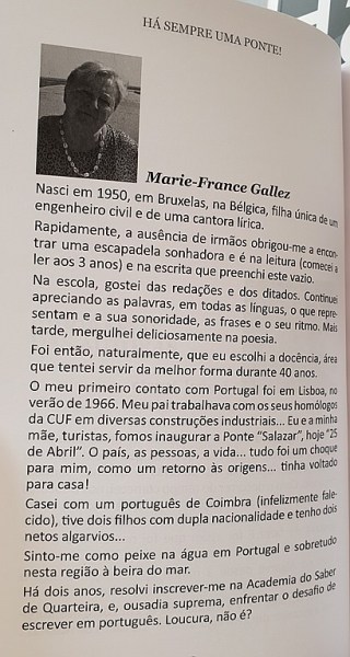 Por seu lado, Marie-France Gallez destacou: “Este trabalho, improvável para mim, para ser sincera, é uma espécie de sonho do qual talvez vá acordar porque, há 14 anos, depois de me aposentar do Ensino em Bruxelas, quando decidi vir viver para Portugal, estava longe de maginar isto. Entretanto, houve uma série de acontecimentos, tais como o falecimento do meu marido e a pandemia do Covid. Depois, a partilha de conhecimentos entre vários grupos culturais e os encontros, em especial, com as minhas duas parceiras nesta aventura. Uma alma gémea é alguém que tem fechaduras que cabem nas nossas chaves e chaves que cabem nas nossas fechaduras. Foi o escritor norte-americano Richard Bach quem escreveu isto e não poderia ser mais verdadeiro. Elas não são apenas almas gémeas mas também provocadoras. Porquê? Porque a minha língua mais que materna, a dos meus antepassados, das minhas escolas, me orgulha com paixão. Uma língua que manejo, que manipulo, com a qual penso e sonho, é o Francês. Então, desafiarem-me, com sucesso, a escrever em Português, não foi tarefa fácil. Mas eu gosto de enfrentar desafios, sou curiosa… por que não? Eu vejo o mundo através dos maravilhosos óculos das línguas. Frases bonitas são a minha droga. 5 ou 6 palavras que, alinhadas na ordem certa, resumem meses de experiência”.