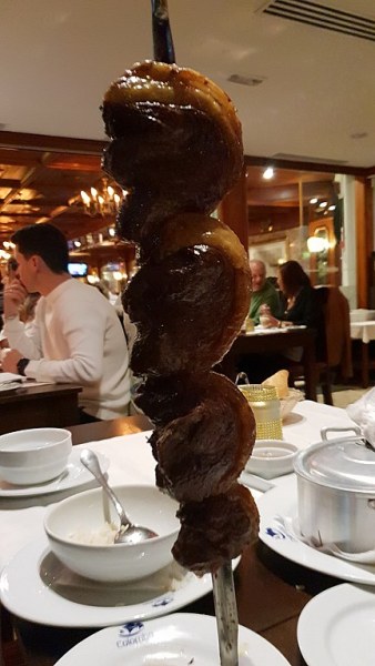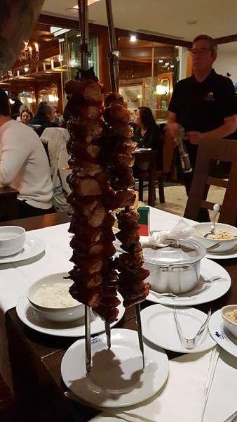 A destacar ainda “o grande Buffet de Entrada para as pessoas que optarem pelo Rodízio. As pessoas podem servir-se as vezes que entenderem porque está sempre a ser reposto. Quando acabarem o buffet, têm um pino na mesa com duas cores, vermelho e verde e, quando estão prontos para a carne, basta virarem o pino com a cor verde para cima, sem necessidade de fazerem sinais ou chamarem pelos funcionários. A partir daí, os cortadores começam a trazer as carnes para a mesa”.