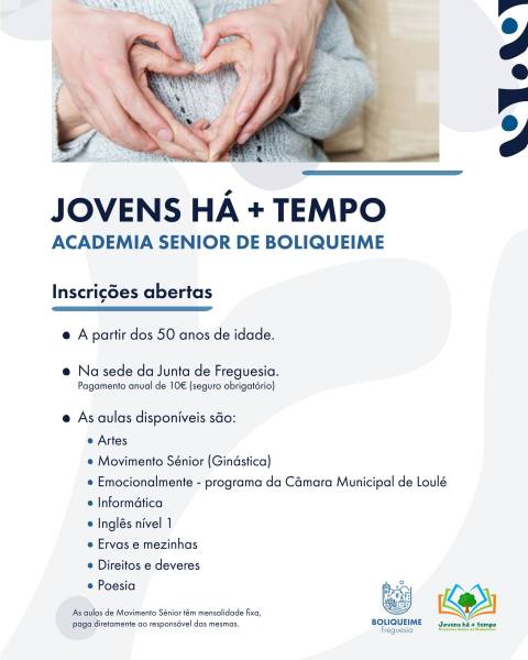 As inscrições encontram-se abertas e podem ser efetuadas nas instalações da Junta de Freguesia de Boliqueime. A oferta formativa inclui aulas de Artes, dinamizadas por Artemisa Santa-Rita; Movimento Sénior (Ginástica), com Carina Soares; Educação Emocional, programa da Câmara Municipal de Loulé, com Hermínia Martins; Informática, com Cátia Gonçalves; Inglês – nível I, com Angélique Alho; Ervas e Mezinhas, com Patrícia Jacinto; Direitos e Deveres, com Joana Gago; e Poesia, com Domitília Gonçalves.