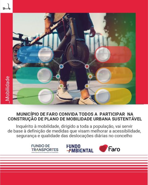 O Município de Faro encontra-se a desenvolver o Plano de Mobilidade Urbana Sustentável (PMUS) do concelho, dando continuidade ao trabalho iniciado com o Plano de Mobilidade e Transportes elaborado em 2018. Para construção deste instrumento estratégico fundamental para definição das políticas de mobilidade do concelho, com impacto direto na qualidade de vida, acessibilidade, segurança rodoviária e sustentabilidade ambiental, está a decorrer neste momento um inquérito à mobilidade, dirigido a toda a população (disponível no seguinte link: https://forms.gle/rnX6rgA5rD5z7H9E9).
