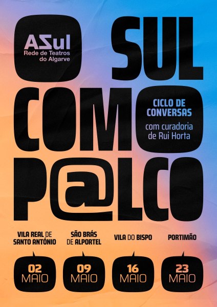 A Rede AZul – Rede de Teatros do Algarve, no âmbito do convite lançado ao programador cultural e coreógrafo Rui Horta para a curadoria de um ciclo de conversas sobre o papel das artes performativas e dos equipamentos culturais no Algarve contemporâneo, apresenta o evento “O Sul como Palco” . Serão quatro momentos, com convidados distintos, a acontecer em quatro localidades – Vila Real de Santo António, São Brás de Alportel, Vila do Bispo e Portimão – durante o mês de maio. A moderação do ciclo será da responsabilidade de Rui Horta, figura central da dança e da programação cultural em Portugal, que trará o seu olhar crítico e propositivo para o debate.